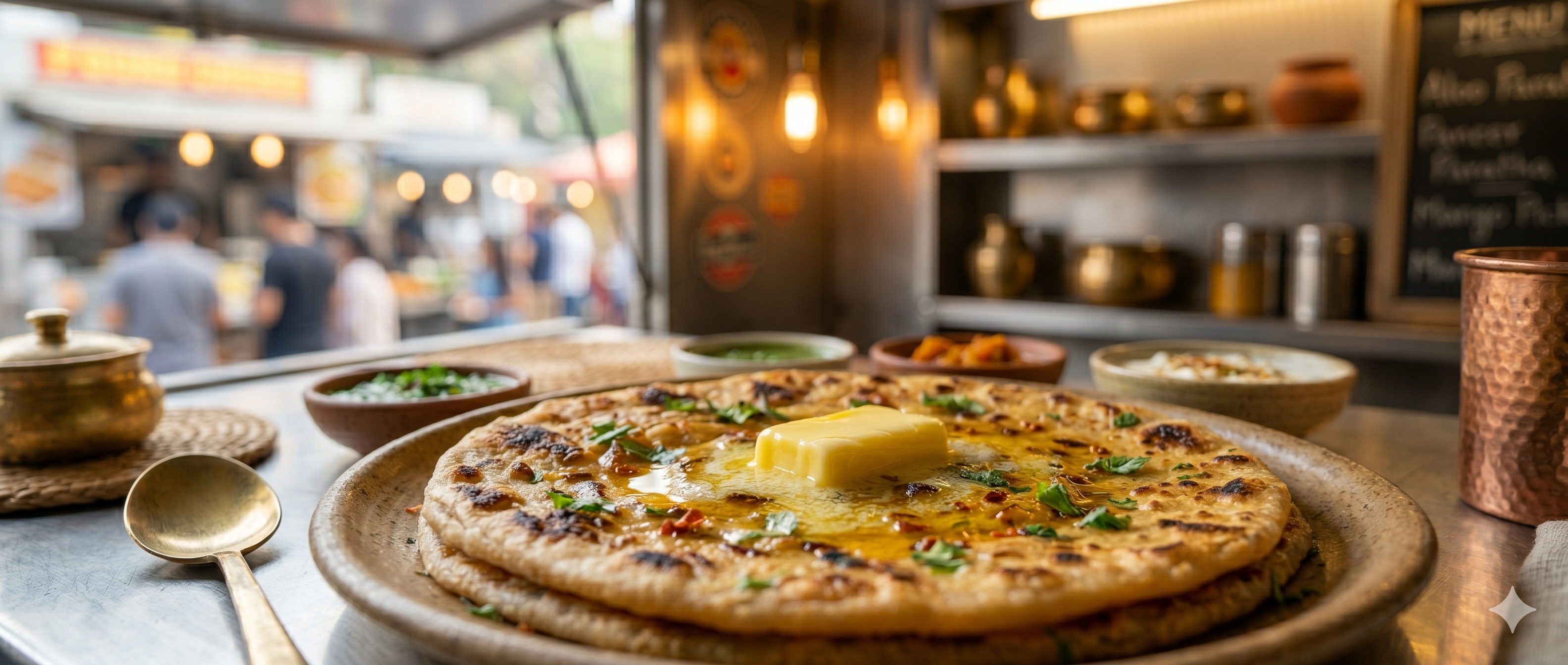 Every morning, our chefs hand-knead dough from stone-ground atta, fill it with seasonal ingredients, and cook each piece on a seasoned cast-iron tawa with pure desi ghee. No shortcuts. No compromise. Ever.
